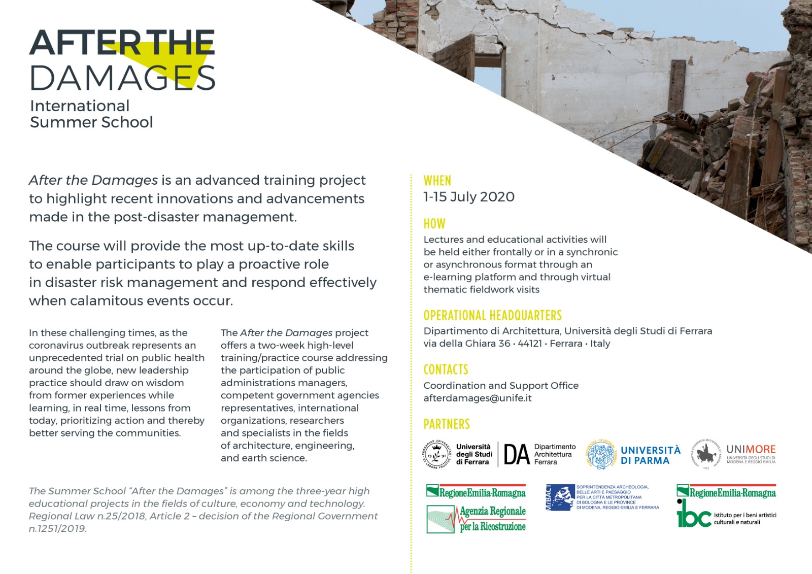 La summer school After the damages rientra tra i progetti triennali di alta formazione della Regione Emilia Romagna. La scuola vede il coinvolgimento dellUniversità di Ferrara, dellUniversità di Parma, dellUniversità di Modena e Reggio Emilia nonché della Regione Emilia Romagna e della Soprintendenza Archeologia, belle arti e paesaggio per la città metropolitana di Bologna e le province di Modena, Reggio Emilia e Ferrara.